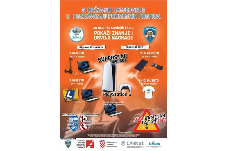 Pozivaju se SVI UČENICI SREDNJE ŠKOLE SLUNJ na sudjelovanje na trećem Državnom natjecanju učenika srednjih škola iz Republike Hrvatske u poznavanju prometnih propisa koje će se održati na web stranicama Prometne Učilice https://ucilica.skole.hr.